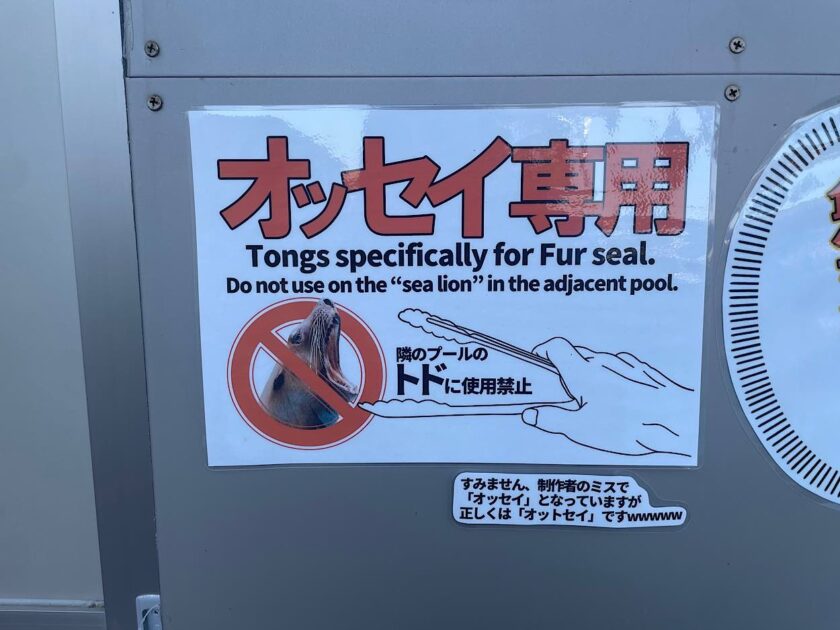オットセイのいるプールのそばに魚がたくさん入ったクーラーボックスと、お金を入れる箱が置いてあります💫