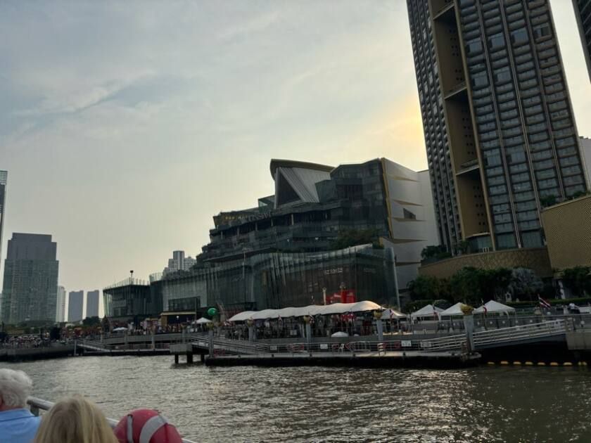 沿岸には高層ビルや近代的なホテルが立ち並ぶ一方で、歴史ある寺院や伝統的な建物も混在しており、バンコクならではの都市と歴史の共存を感じられます。