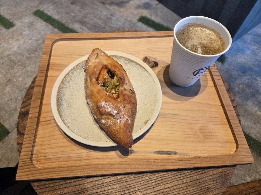 あまーいパンから惣菜パンまで種類の多さに迷いましたが、今回選んだのはサーモンときのこのブレッドとほうじ茶ラテです!