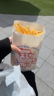 このお店はホットドックがメインだったそうですが、あまりの大きさにポテトが名物になったそうです!