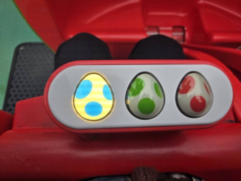 ヨッシーアドベンチャーは、ヨッシーの背中に乗り込んで3つのタマゴを見つけ出すアトラクションです。
